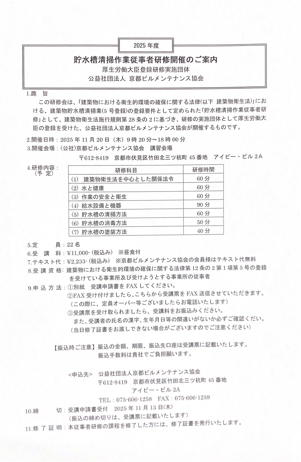【研修案内】11/20 貯水槽清掃作業従事者研修を開催いたします