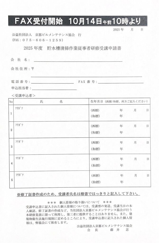 この研修は、建築物貯水槽清掃業(5号登録)の登録要件として定められているもので、