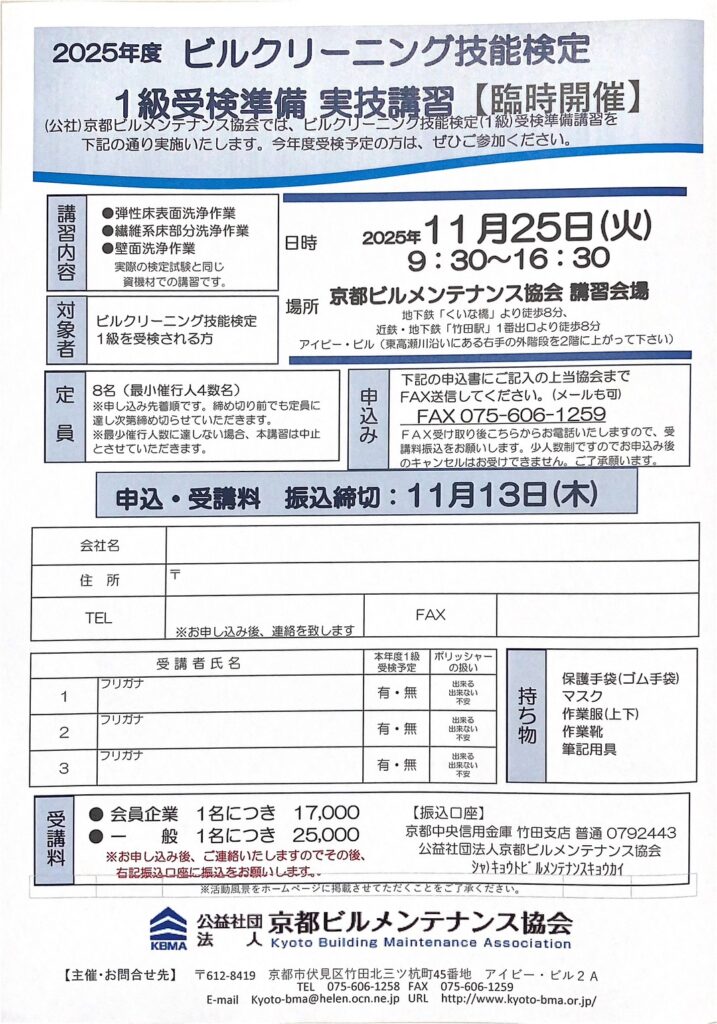 【講習案内】11/25 ビルクリーニング1級受検準備講習が開講されます ビルクリーニング1級受検準備講習が開講されます。 令和7年11月25日(火)9:30~16:30 ⚠受講日をお間違えの無いようお申込みください⚠ 2025.11.25 1級 臨時開催 申込用紙