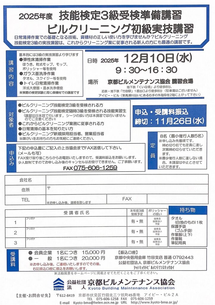 【講習案内】12/10 ビルクリーニング3級受検準備講習が開講されます ビルクリーニング3級受検準備講習が開講されます。 令和7年12月10日(水)9:30~16:30 ⚠受講日をお間違えの無いようお申込みください 2025.12.10 3級 申込用紙