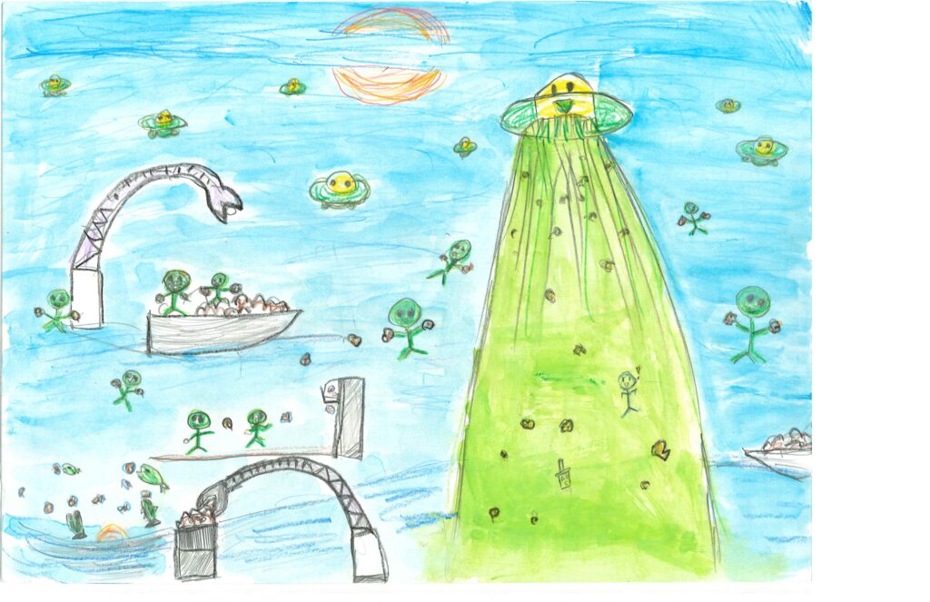 おそうじロボットとみどりの光せんできれいになる うみのゴミはさかなロボットがたべる