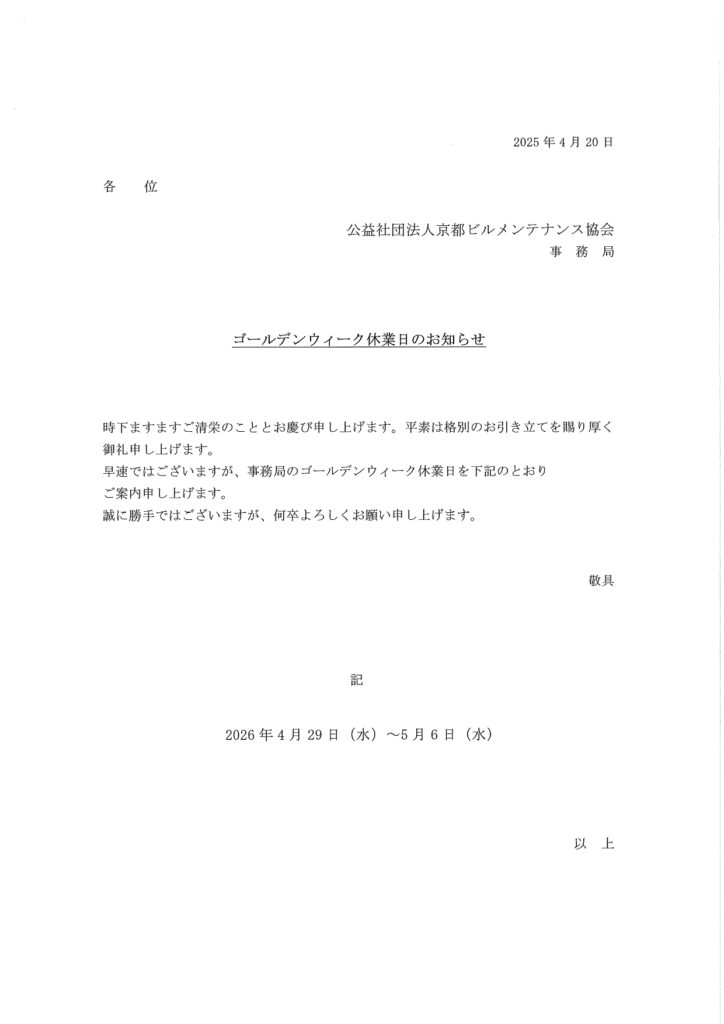 誠に勝手ながら、京都ビルメンテナンス協会事務局は